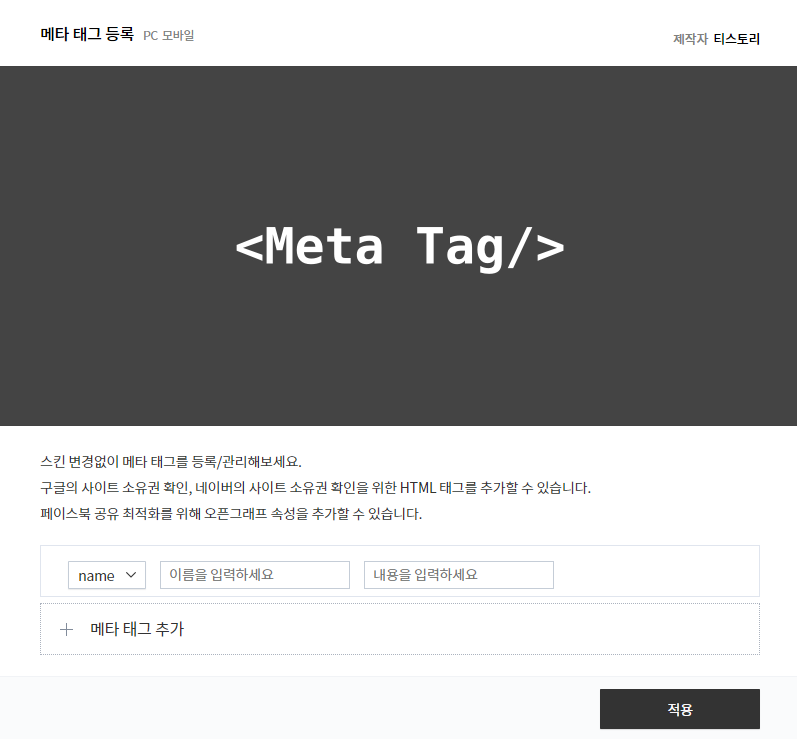 티스토리 블로그에서는 직접 HTML을 수정할 경우, 스킨을 변경했을때 사용자가 임의로 작성한 코드가 모두 삭제될 수 있습니다. 그럴때 이용할 수 있는 것이 바로 Meta Tag 플러그인 입니다.