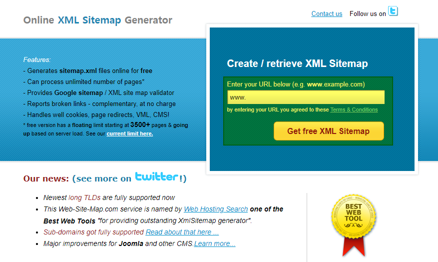 Our news: (see more on !) Newest long TLDs are fully supported now This Web-Site-Map.com service is named by Web Hosting Search one of the Best Web Tools "for providing outstanding XmlSitemap generator". Sub-domains got fully supported Read about that here
