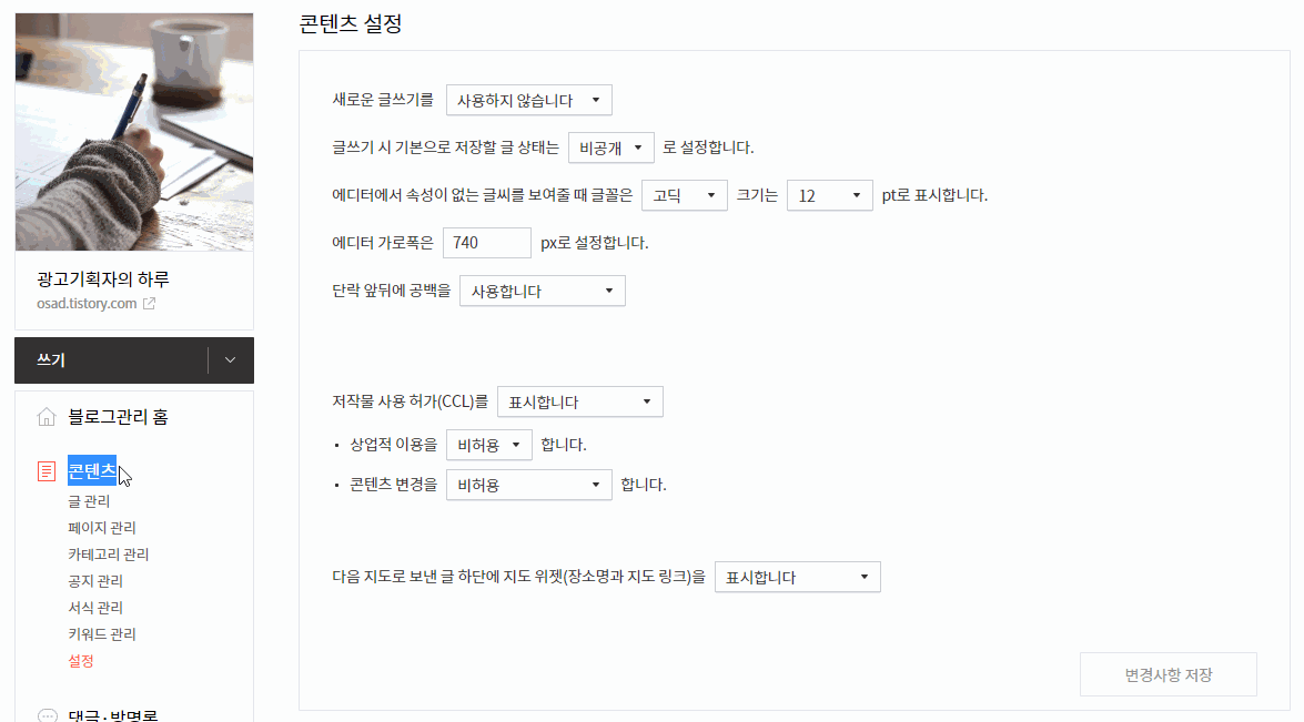 블로그 관리 페이지에서 콘텐츠 설정 으로 들어가면 '새로운 글쓰기' 사용 여부를 선택할 수 있습니다. '사용하지 않습니다'를 선택한 후 '변경사항 저장'을 눌러줍니다.