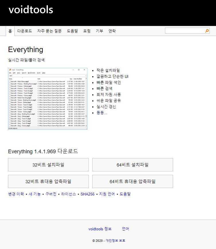그래서 혹시 파일 검색 속도가 빠른 프로그램이 있을까? 하고 찾아봤더니 있었습니다. 그리고 써보니 정말 검색을 하자마자 결과를 보여주더군요. 바로 voidtools의 Everything이라는 프로그램입니다. 홈페이지 접속하시면 위 이미지와 같이 아래부분에 다운로드 버튼이 존재합니다. 공식홈페이지에서 최신버전으로 다운받으시는 것을 추천드립니다.