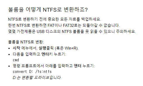 한 가지 주의할 점이라면 하드 드라이브 볼륨이 NTFS일 경우에만 사용 가능한 것으로 확인되는데요, 요즘은 대부분 NTFS로 처음부터 사용하시니 문제 되지 않겠지만 만약 FAT나 FAT32를 사용하는 메모리나 드라이브라면 변경을 해줘야 합니다. 변경 방법은 홈페이지에도 나와있지만 해당 부분만 아래를 간단히 참고해보시면 되겠습니다.