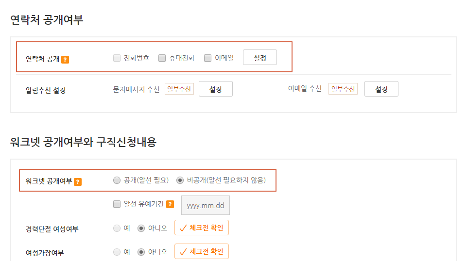 아직 직업훈련(학원 수강)을 하지 않았는데 왜 구직신청을 지금 할까? 조금 의아했다. 아직 준비가 안되었는데 기업체에서 연락 오는 거 아닌가? 그런 생각도 들었는데 '연락처 공개', '워크넷 공개 여부'에서 비공개로 설정하면 된다.