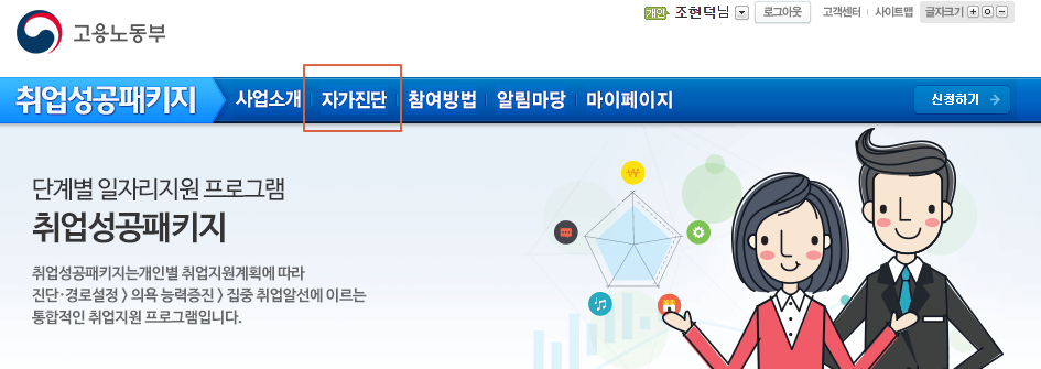 '자가진단'은 고용노동부 홈페이지(https://www.work.go.kr/pkg/succ/index.do)에서 상단 메뉴 중 [자가진단]을 진행하면 된다.
