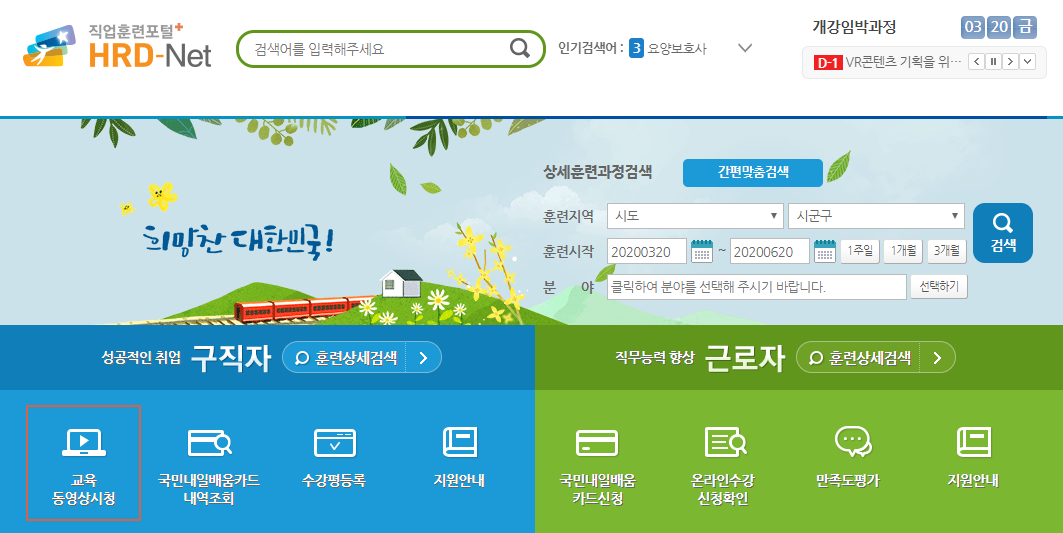 '훈련 동영상 시청'을 해야 하는데 HRD-NET 홈페이지(http://hrd.go.kr/)에서 좌측 중앙에 '교육 동영상 시청'이라는 메뉴가 있다.