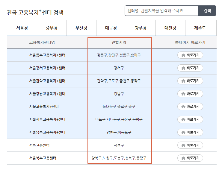 반드시 '고용복지센터' 홈페이지에서 '관할지역'을 확인하고, 해당하는 센터에 방문해야 한다.
