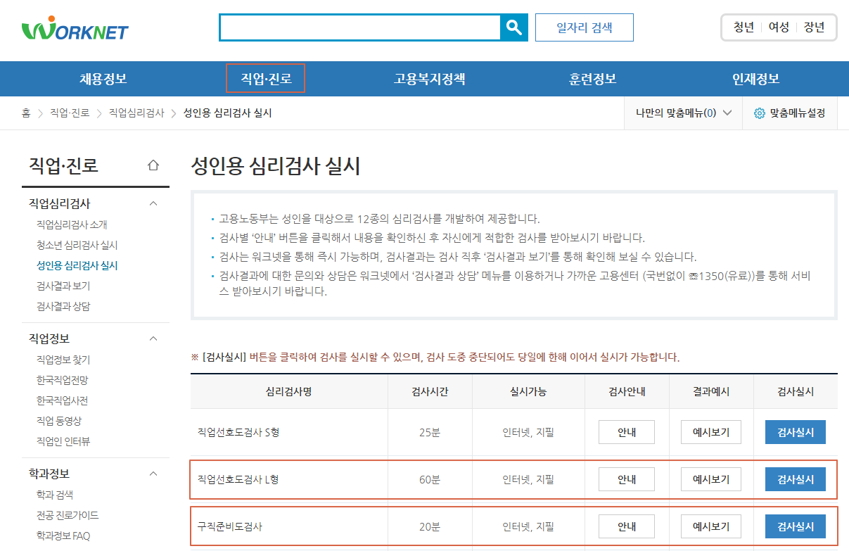 '직업심리검사'는 워크넷 '직업/진로' 메뉴(https://www.work.go.kr/consltJobCarpa/jobPsyExamNew/jobPsyExamAdultList.do)에서 '성인용 심리검사 실시' > '직업선호도 검사 L형'과 '구직 준비도 검사'를 실시하면 된다.