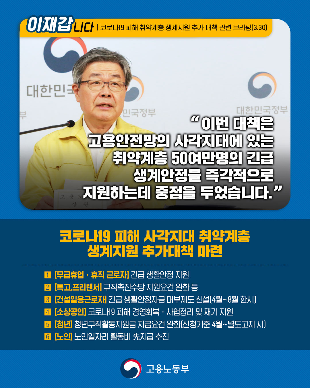 이번 대책은 무급 휴업, 휴직 노동자, 특수형태 근로종사자 등, 고용안전망의 사각지대에 있는 취약계층 50여만 명의 긴급생계안정을 즉각적으로 지원하는데 주안점을 두고 있습니다.