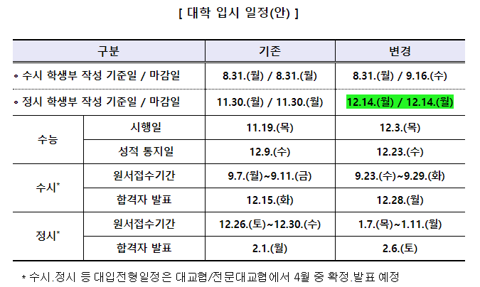 변경된 수능 시행일 등을 반영한 "대입전형일정 변경(안)"은 교육부의 요청에 따라 4월 중 확정, 발표할 계획이다.