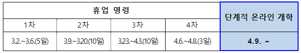 - 유치원 : 등교 개학의 기준이 충족될 때까지 신학기 휴업을 연장