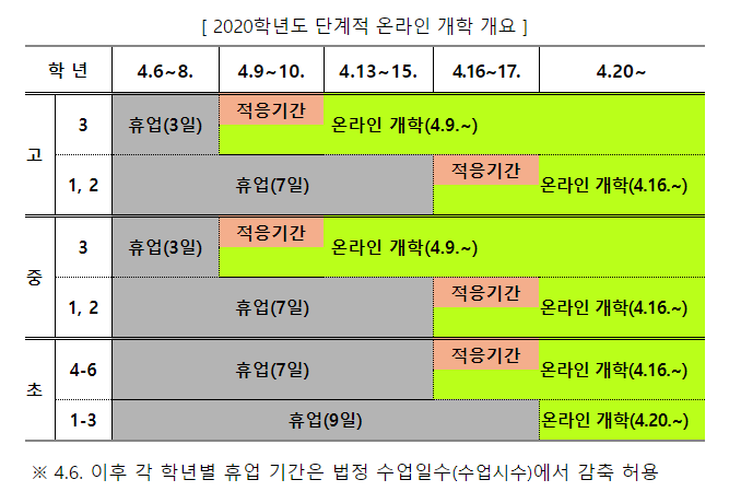 - 4월 1일(수)부터 1주일간의 준비기간을 거쳐, 4월 9일(목)부터 시차를 두어 온라인 개학을 실시한다.