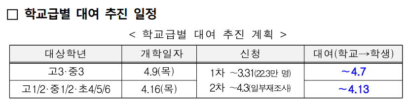 - 대여 신청자가 있는 학교에서 대여일정과 대여방식은 온라인 개학 전까지 학부모에게 안내, 대여 완료 추진.