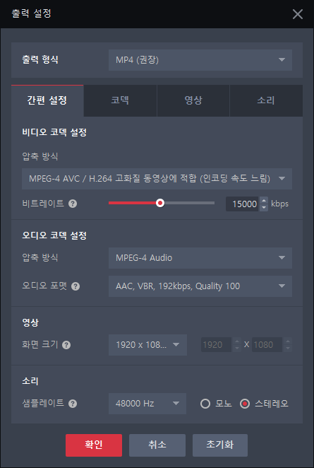 - 오디오 코덱 : AAC-LC / 스테레오 채널 / 샘플링 비율 96kHz(48kHz)