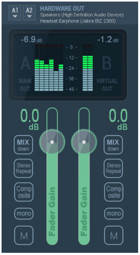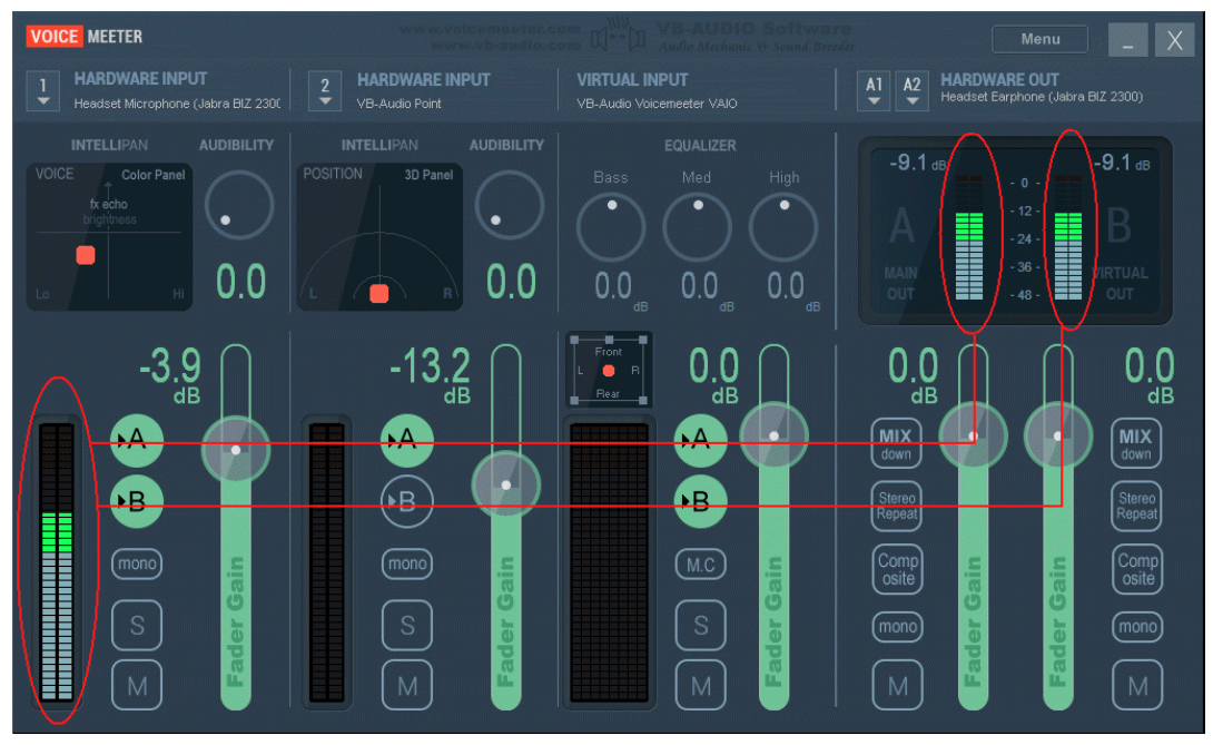 2단계 후 VoiceMeeter는 선택된 입력(예: 마이크)에서 A1이 선택한 출력으로 신호를 라우팅하고 있다. 그러면 당신은 이 오디오 출력에서 입력 #1로 들어오는 소리를 들을 수 있다. A & B 버튼은 BUS A 또는/및 BUS B에서 신호를 보내기 위한 스위치 입니다.