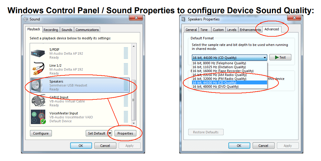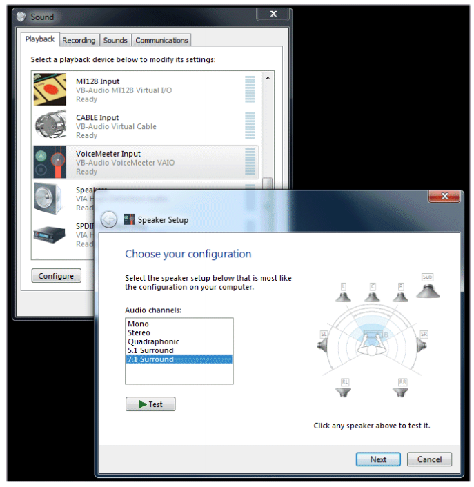 Windows System Audio Configuration은 주로 Windows 제어판 / 사운드 대화 상자에 위치한다. 여기서 기본 재생 장치 및 기본 녹음 장치(VOIP 애플리케이션과 함께 보이스미터를 사용할 경우 통신 옵션을 "사용안함"으로 설정해야 함)를 확인하거나 설정해야 한다.