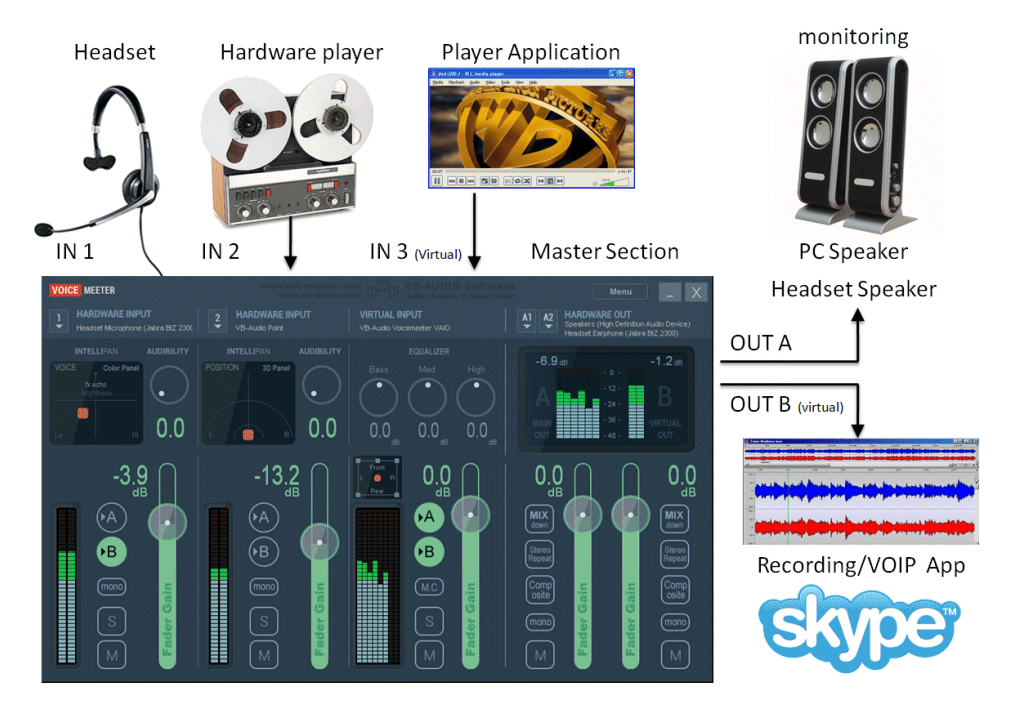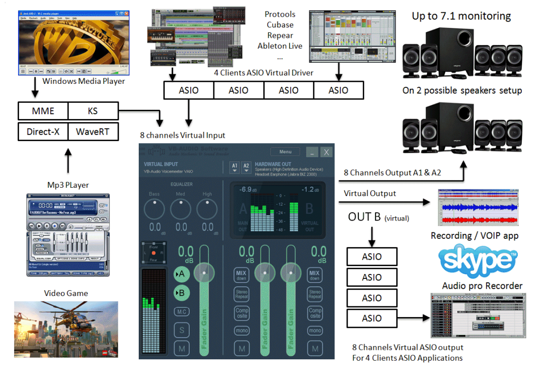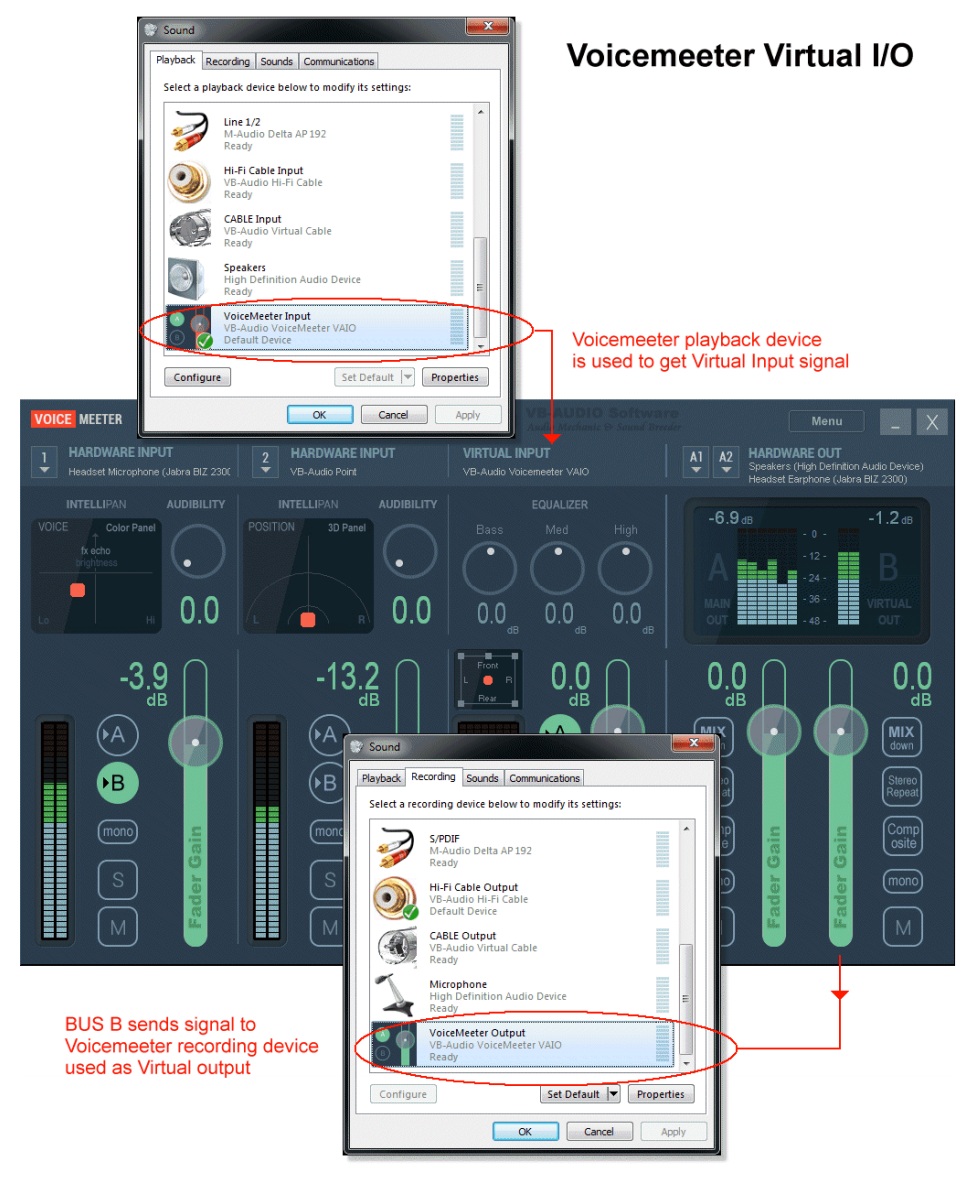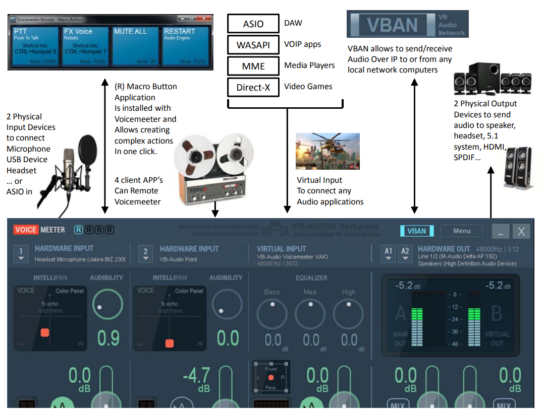 보이스미터VoiceMeeter 가상 입력 및 출력은 보이스미터VoiceMeeter를 사용하여 운영 체제에 설치된 가상 오디오 드라이버 재생 및 기록 장치에 의해 간단히 제공된다.