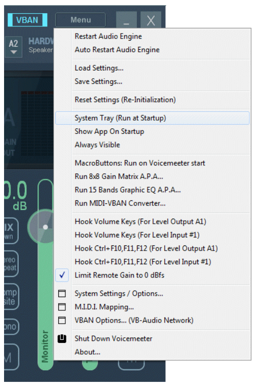 - System Tray (Run at Startup) : 보이스미터VoiceMeeter를 시스템 트레이에 설정한다. (이 경우 시스템 시작 시 실행됨)
