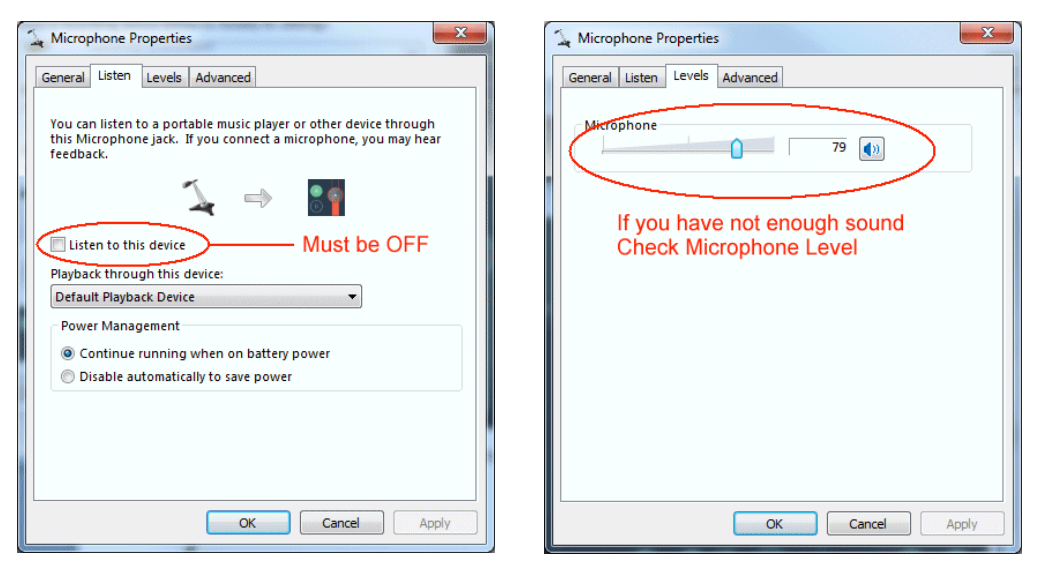 (아래에서 좌측 이미지 설명 : ) Windows "Listen" 옵션은 Voicemeeter 라우팅을 방해할 수 있으므로 이 옵션이 비활성화되어 있거나 사용자에게 적합한지 확인하십시오. (한글로는 소리>녹음>속성>수신 대기>"이 장치로 듣기" 입니다.)