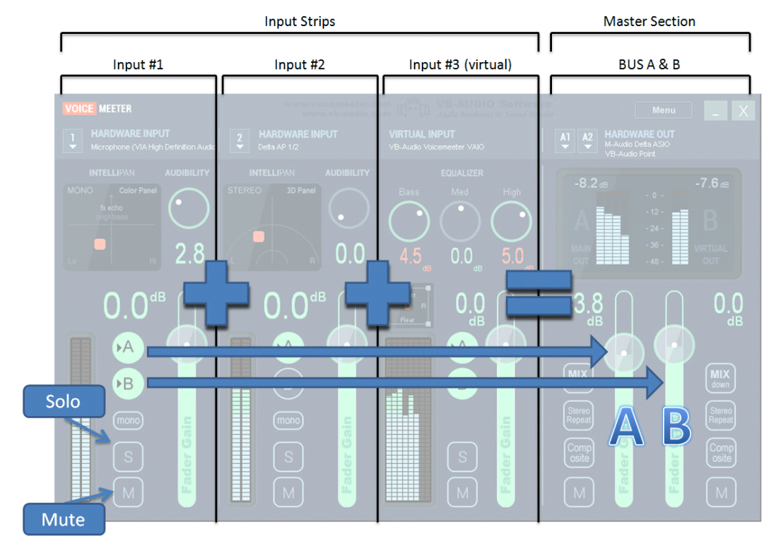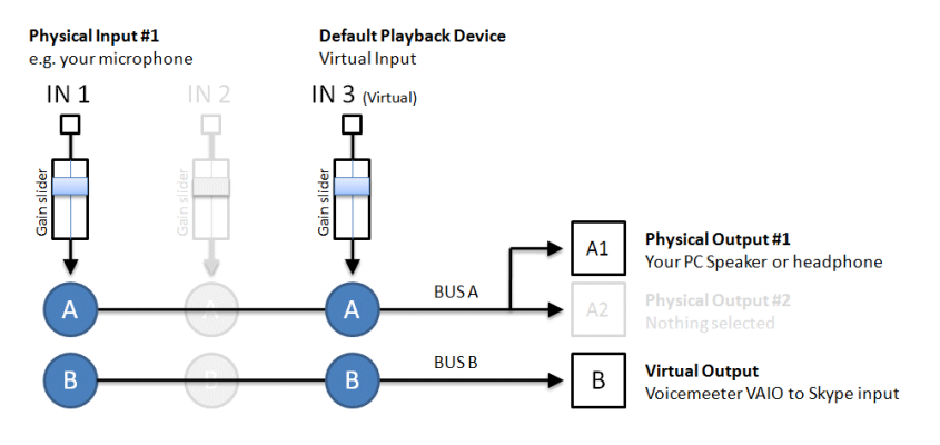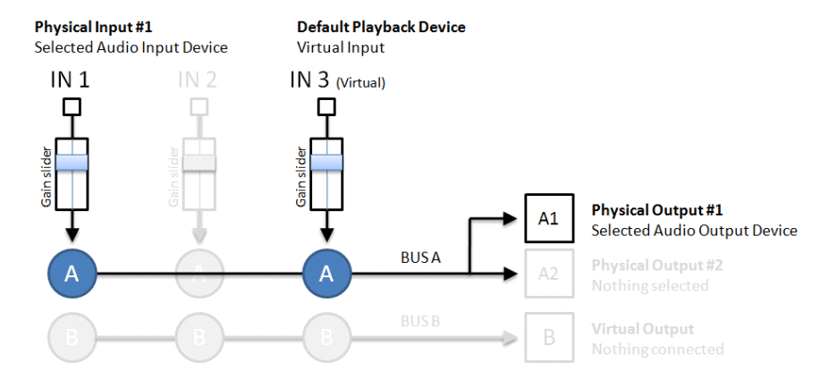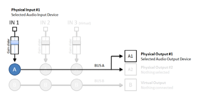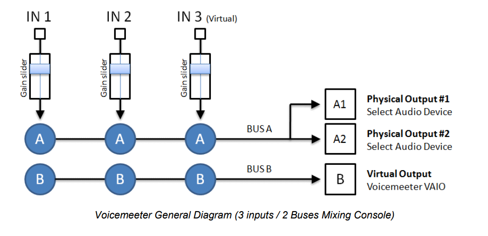 위의 스키마는 기본적으로 VoiceMeeter가 3개의 입력을 2개의 버스로 혼합하는 방법을 보여준다(버튼 A가 켜진 경우 BUS B에서 버튼 B가 켜진 경우). 일반적으로 버스A는 모니터링(스피커)에 사용할 수 있으며, 버스B는 VOIP 또는 오디오 녹음 애플리케이션에 사용할 수 있다.