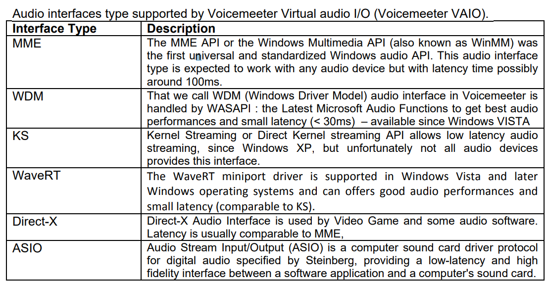 - WDM : Voicemeter에서 WDM(Windows 드라이버 모델) 오디오 인터페이스라고 부르는 것은 WASAPI: Windows VISTA 이후 최고의 오디오 성능과 짧은 대기 시간(< 30ms)을 얻기 위한 최신 Microsoft 오디오 기능(WASAPI)에서 처리한다.