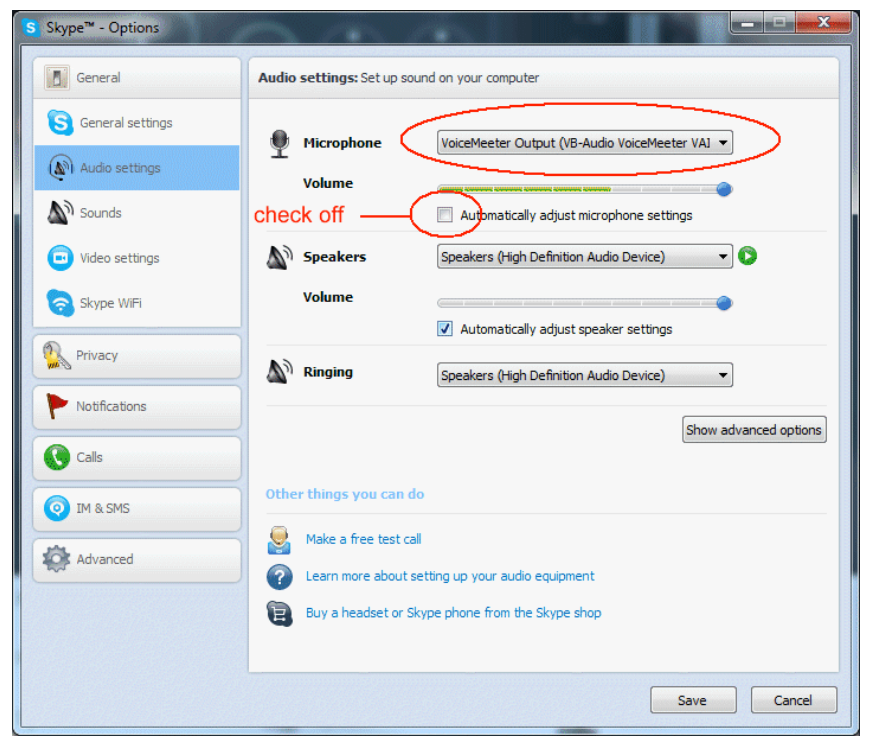 예를 들어 Skype에서 Voicemeeter 가상 출력을 마이크로폰으로 선택할 수 있다.