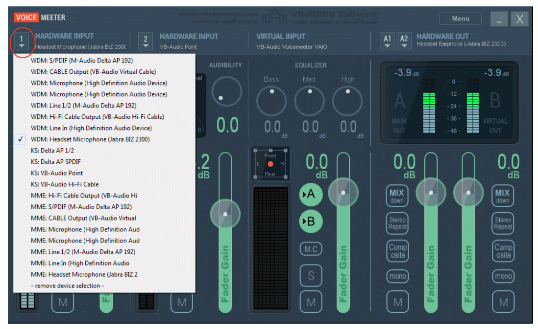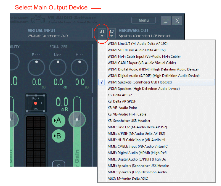 보이스미터VoiceMeeter를 작동시키려면 최소한 BUS A(A1)에 사용되는 주 출력 장치를 선택해야 한다. 가장 좋은 지연 시간을 얻기 위해 ASIO(있는 경우) 또는 WDM장치 유형을 먼저 선택하는 것이 좋다.(WDM/KS 재생 장치는 기본적으로 베타적 모드로 사용되며, 윈도우 믹서 및 그 볼륨 제어를 우회한다.)