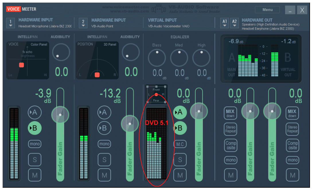 DVD를 재생할 때 Voicemeeter 가상 입력 및 가능한 A 출력 레벨(출력 장치가 동일한 수의 채널을 지원하는 경우)에서 5.1 오디오 신호가 수신되는 것을 볼 수 있다.