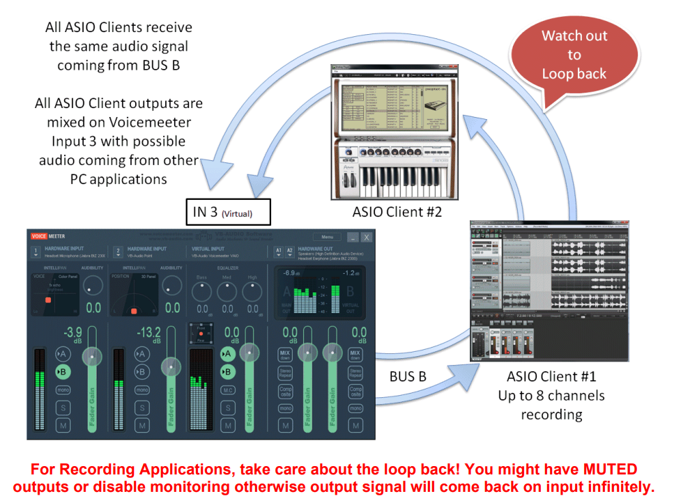 또한 각 Voicemeeter Virtual I/O는 4개의 클라이언트 애플리케이션을 관리할 수 있는 ASIO 인터페이스를 지원한다. 이 4개의 가능한 소스는 BUS B1(Voicemeeter Virtual ASIO의 경우)에서 신호를 수신하고 관련 가상 입력(일반적인 윈도우 오디오 인터페이스에서 이미 PC 사운드가 제공됨)에서 이들의 출력이 함께 혼합된다.