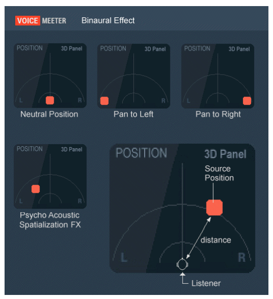 보이스미터VoiceMeeter는 오디오 소스에 공간적 정체성을 부여한 후 대화 이해성을 높일 수 있는 생체역학적 효과를 포함한다(특히 모든 사람이 동시에 대화할 때).