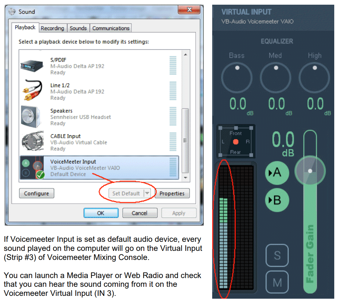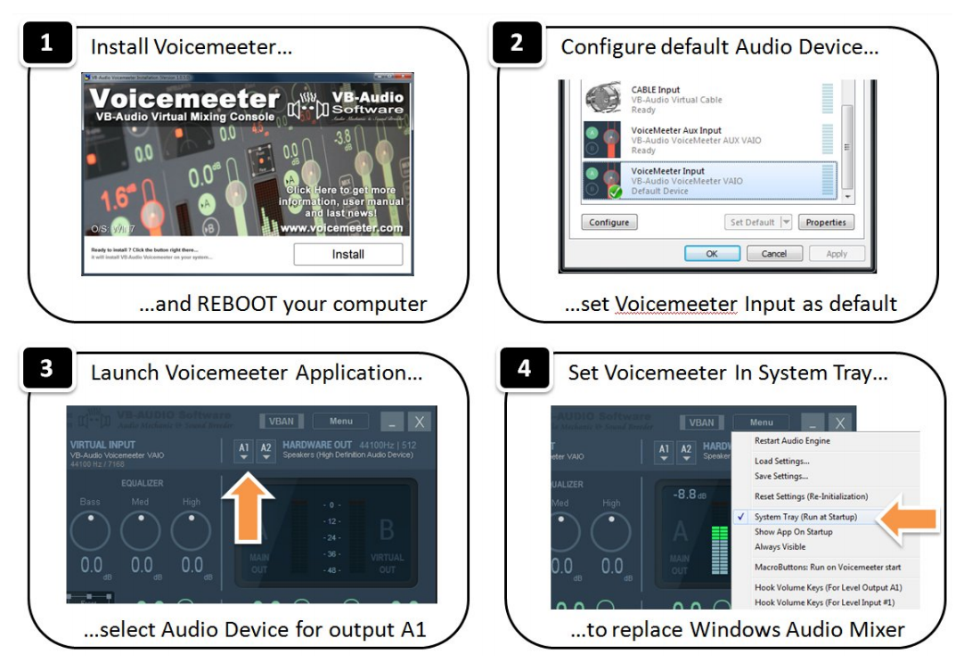 보이스미터는 윈도 믹서를 대체하기 위한 가상 오디오 믹서다. 보이스미터를 구성하는 가장 빠른 방법은 간단히 기본 장치로 사용하여 주 장치에 연결하는 것이다. 그러면 모든 PC 소리가 보이스미터를 거쳐 스피커로 재생될 것이다.