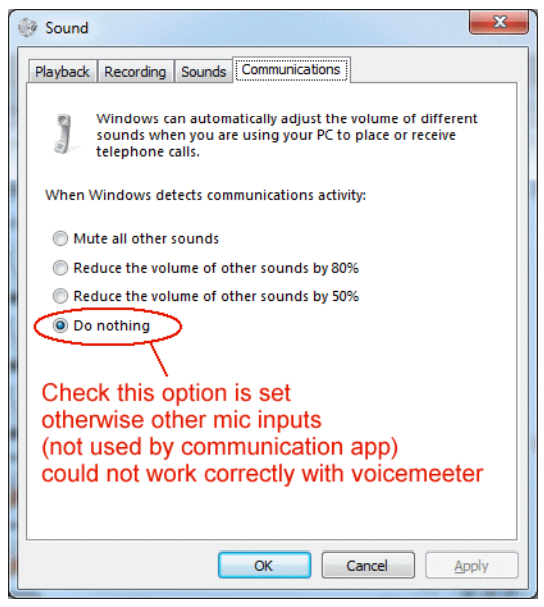 이 옵션이 설정되어 있는지 확인하십시오. 그렇지 않으면 다른 마이크 입력(통신 앱에서 사용되지 않음)이 보이스미터VoiceMeeter에서 올바르게 작동하지 않을 수 있음 (한글로는 소리>통신>"아무 작업도 안 함" 옵션)