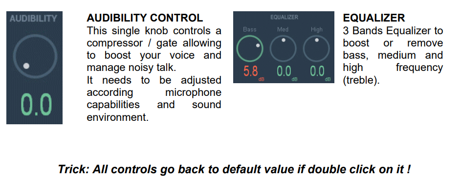 2D Panel, Audibility nob 또는 간단한 3개 밴드 Equalizer 등 다양한 컨트롤로 실시간으로 음성을 조절할 수 있다.