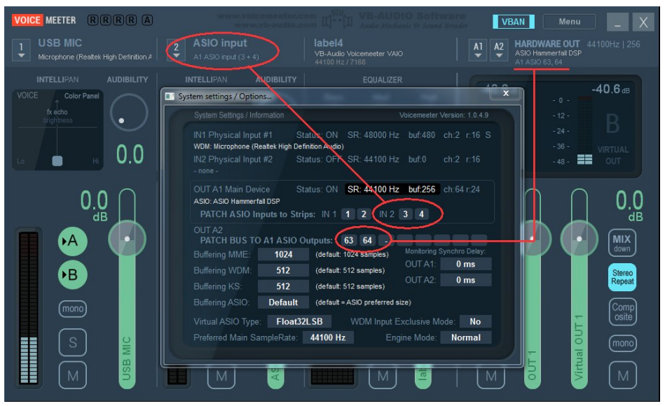 Voicemeeter 1.0.5.0 / 2.0.3.0을 사용하면 출력 A1로 선택한 ASIO 드라이버의 가능한 64 I/O로 모든 물리적 입력과 버스를 라우팅할 수 있다. 전문적인 오디오 보드와 함께 보이스미터Voicemeeter를 사용하는 것이 최적의 방법이다.