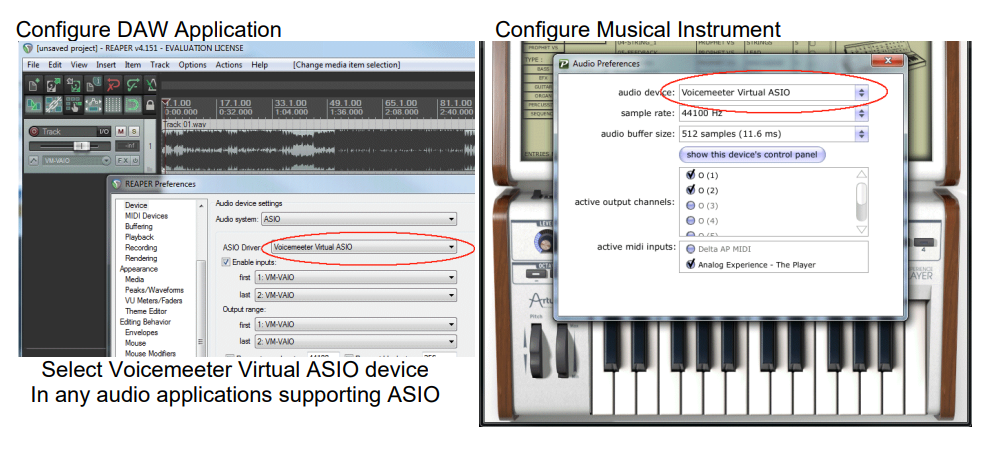 ASIO를 지원하는 모든 오디오 응용 프로그램에서 Voicemeeter Virtual ASIO 장치 선택
