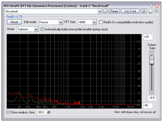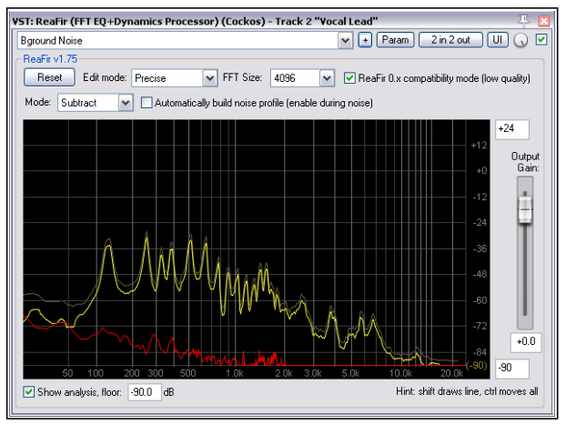 ReaFir의 Subtract 모드는 노이즈 감소Noise Reduction에 탁월합니다! 트랙 녹음 배경에 노이즈 (예 : 희미한 윙윙 거리는 소리)가있을 때 특히 유용합니다.