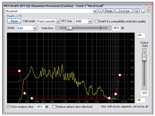 - Analysis floor : 표시된 가장 낮은 분석 값을 선택할 수 있습니다. 일반적으로이 설정을 낮은 범위의 곡선 범위 조정 (위)과 동일하게 유지해야하지만 때로는 다르게 할 수도 있습니다. 예를 들어, 조정 범위를 12 ..- 12로 설정하고 싶지만 분석은 -90dB로 표시됩니다. ReaFir의 분석 디스플레이는 근사치입니다. 이는 디스플레이 품질보다 처리 효율을 우선시 한 결과입니다.