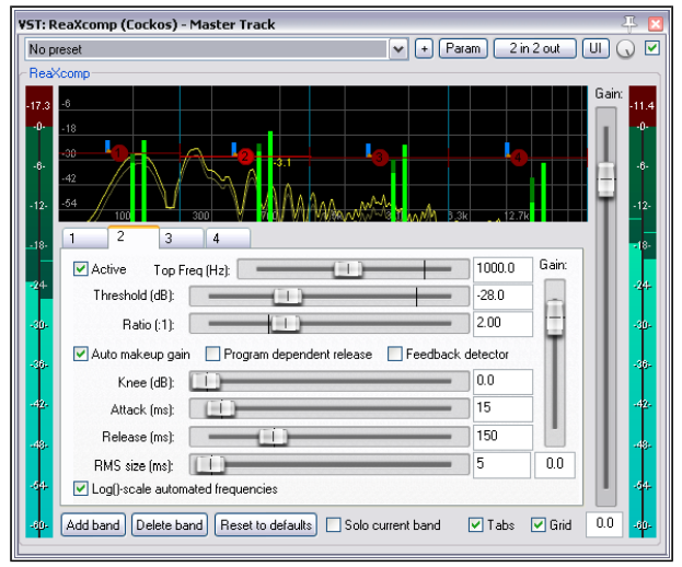 컴프레서 모드에서 ReaFir는 멀티 밴드 컴프레서 역할을합니다. 그러나 일반 멀티 밴드 컴프레서와 ReaFir 간에는 현저한 차이가 있습니다. ReaFir을 사용하면 크로스 오버에 대해 걱정할 필요없이 압축하려는 주파수를보다 구체적으로 선택할 수 있습니다. 또한 컴프레서 모드의 ReaFir는 수백 또는 수천 개의 밴드를 가질 수 있으며 모두 개별적으로 압축 할 수 있습니다.
