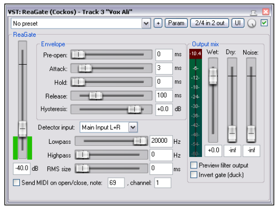 ReaGate는 볼륨이 지정된 임계 값 레벨 아래로 떨어질 때 소리를 걸러내는 가장 일반적인 용도의 노이즈 게이트입니다. 이것은 구절 사이의 보컬 드로잉 호흡과 같은 원하지 않는 소리를 제거하는 데 도움이 될 수 있습니다.