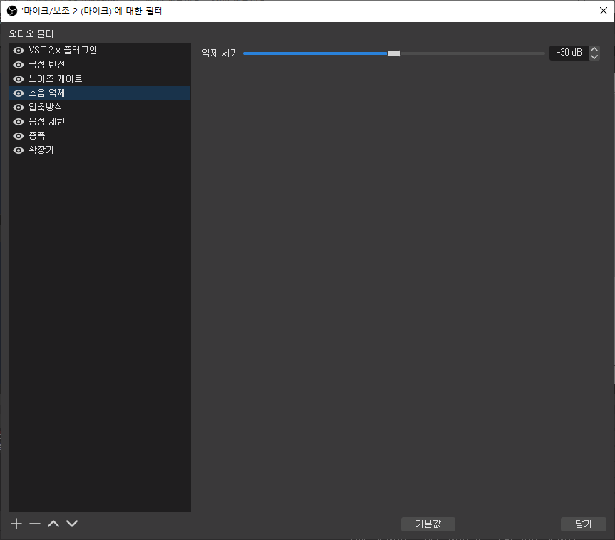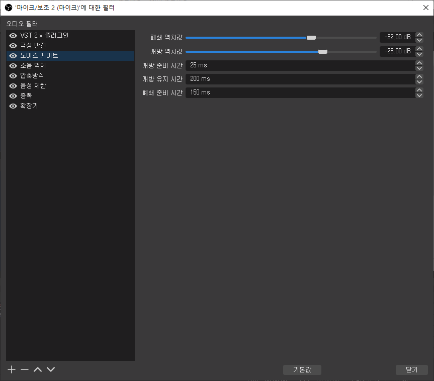 - 폐쇄 역치값 : 설정한 데시벨 이하로는 소리가 차단 됩니다. OBS에서 마이크 입력이 없다고 판단하는 데시벨이므로, 마이크를 켜놓기만해도 잡음이 심할때, 혹은 말하지 않을때 마이크 입력이 안되도록 하고 싶다면 미터기를 체크해서 해당 데시벨 만큼 설정해주면 소리가 들어가지 않습니다.