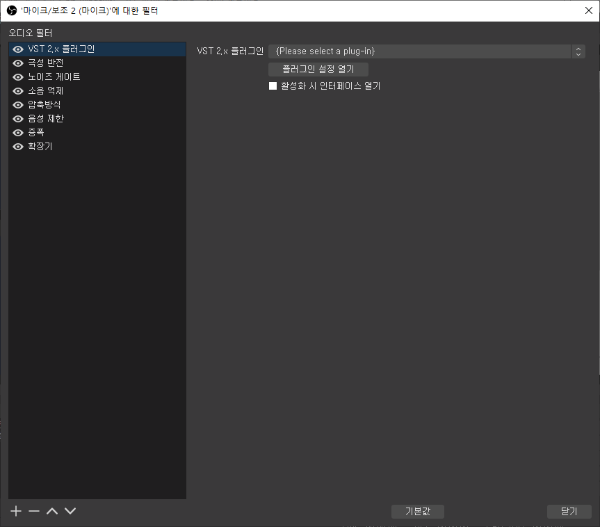 OBS Studio는 많은 VST2.x 플러그인을 지원합니다. VST 플러그인을 추가하는 것은 다른 오디오 필터를 추가하는 것만 큼 간단하지만 몇 가지 제한 사항이 있습니다. VST1.x, VST3.x, VST 플러그인의 MIDI 제어 / 입력 및 쉘 VST 플러그인은 현재 지원되지 않습니다. 모든 플러그인을 테스트하지는 않았으며 일부 VST 플러그인은 충돌을 일으킬 수 있습니다. VST를 실험 할 때 데이터가 손실되지 않도록 설정을 저장하고 백업해야합니다.