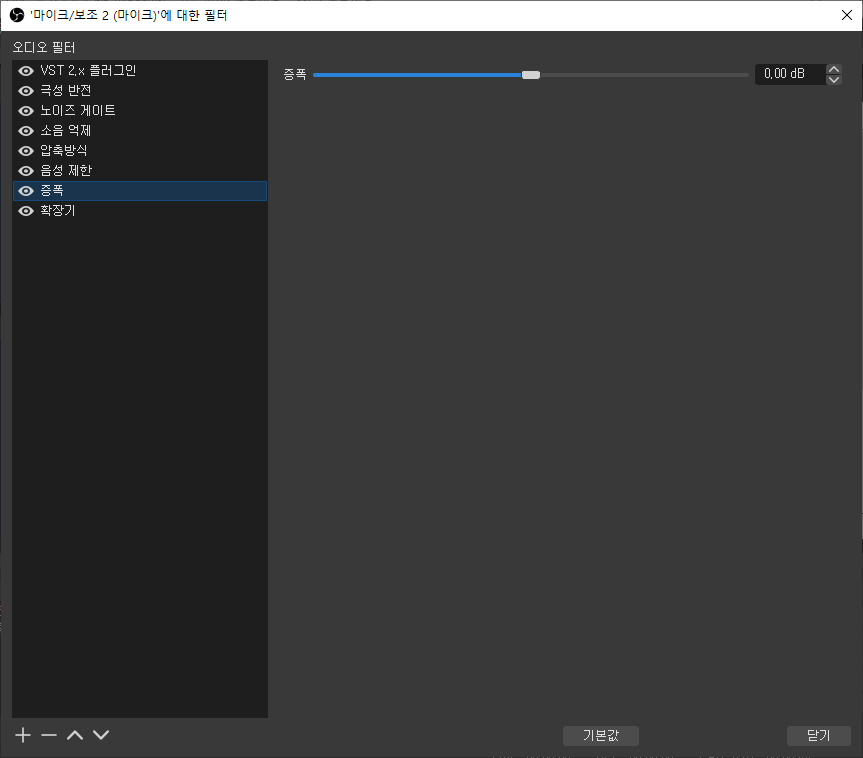 일반적으로 OBS에 도달하기 전에 소스에 적용되어야하지만 필요한 경우 증폭 필터는 볼륨을 높이는 데 도움이 될 수 있습니다. (마이크 볼륨을 증폭시켜준다고 이해하시면 됩니다.)