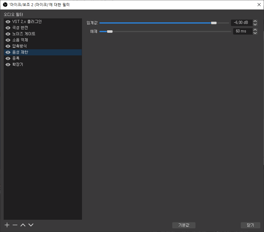 리미터(음성 제한)를 사용할 때는 체인의 마지막 필터여야합니다. (OBS 오디오 필터의 순서도 중요한데, 제일 마지막에 두라는 얘기로 보입니다.)