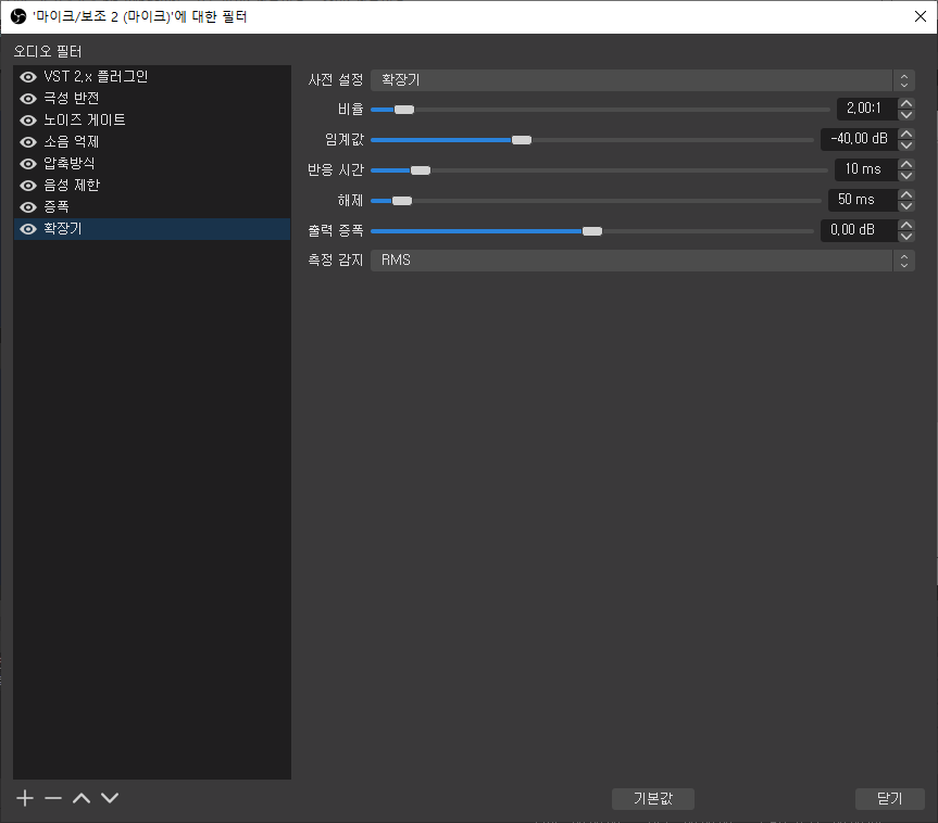- 폐쇄 준비 시간 : 마이크에 소리가 줄어들때 OBS에서 마이크 입력이 없다고 판단하고 입력을 닫는 시간입니다. 너무 빠르게 닫아버리면 부자연스럽고 목소리가 작을때 마이크에 말소리가 들어가지 않게 됩니다. 말 끝이 끊어지게 되므로 적당히 길게 설정해주는 것이 좋습니다. (개인적으로 200~300사이에서 셋팅값을 찾아보시길 바랍니다.)