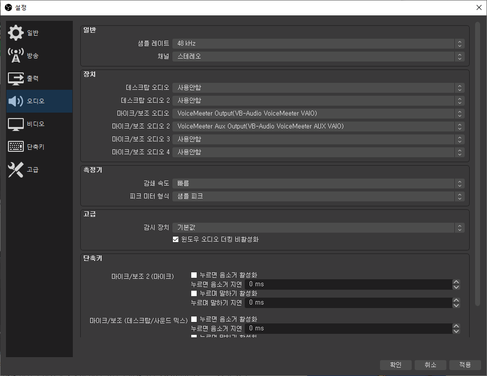 별도로 [오디오] 설정 창도 있는데, 여기서는 데스크탑 오디오, 마이크/보조 오디오를 설정해줍니다.