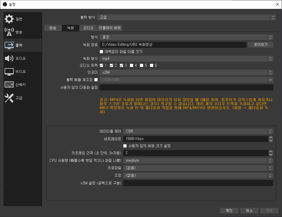 비트레이트 : 15000 Kbps가 1080p 60fps 녹화에서 유튜브 업로드 권장입니다. 똑같이 설정해주었습니다. 너무 크게 하면 화질은 좋아지겠지만 용량이 너무 커져서 편집이나 업로드에 어려움이 생길 수 있습니다. 반대로 너무 작게 설정하면 화질이 떨어지거나 화면이 툭툭 끊길 수 있습니다.