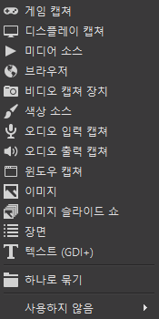 - [장면 목록] 우측의 [소스 목록]을 봅니다. 마찬가지로 [+]를 클릭해서 소스를 추가해줍니다.