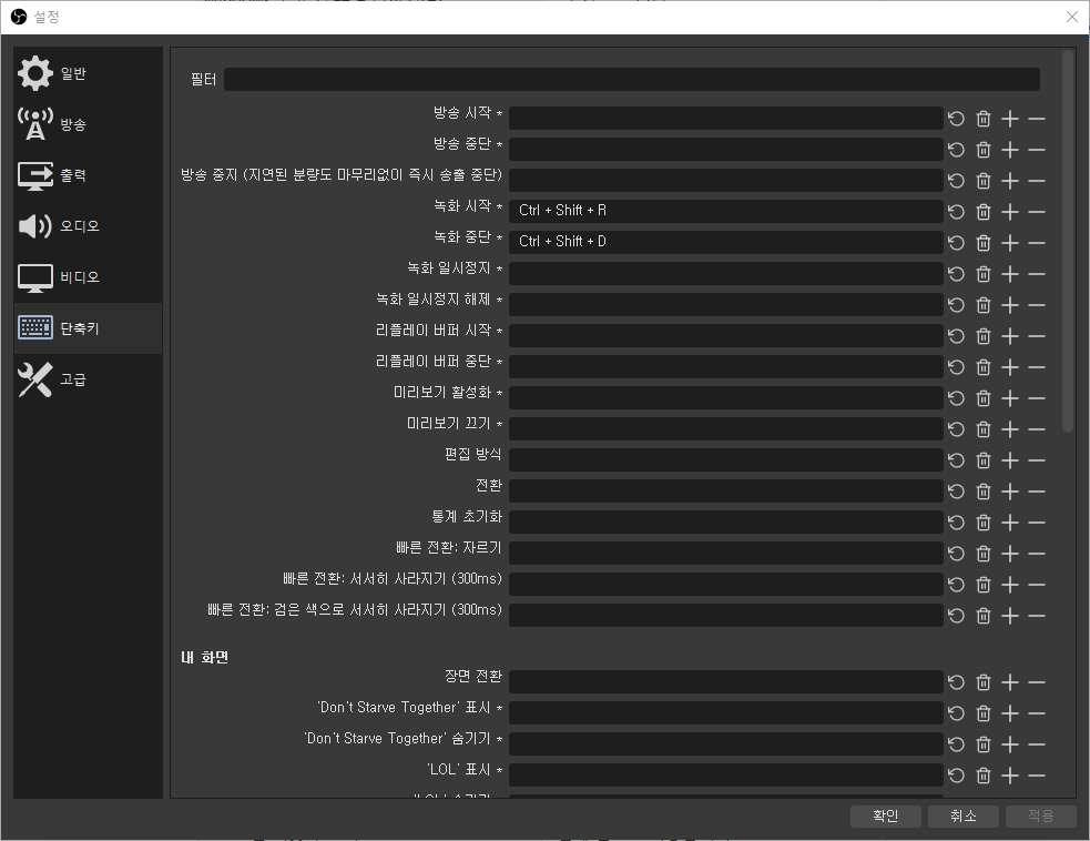 [설정] - [단축키] 로 들어가서, [녹화 시작], [녹화 중단]에 원하는 단축키를 입력하시고, 만약 게임을 녹화하신다면 OBS Studio가 실행 된 상태에서 게임을 실행해주신 뒤, 녹화를 시작하고 싶은 순간에 설정하신 단축키를 누르시면 녹화가 시작됩니다. 그리고 녹화를 끝내고 싶은 지점에서 녹화 중단 단축키를 눌러주시면 됩니다. 저는 위 이미지와 같이 설정해두었습니다. 참고하시면 되겠습니다.