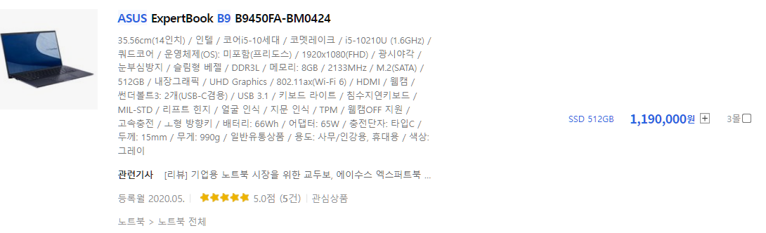 ASUS B9 이라는 모델이 눈에 띄는데 일시품절이다. 그래서 모델명으로 검색해보니 몇가지 모델이 판매중이라고 뜬다.