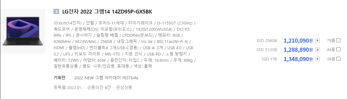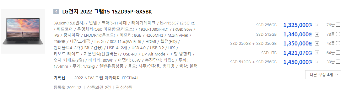 8GB램 모델은 160만원 부터 시작하고, 512GB면 166만원 정도다. SSD 용량 늘리는 것이 램 늘리는 것보다 더 저렴한 것 같다.