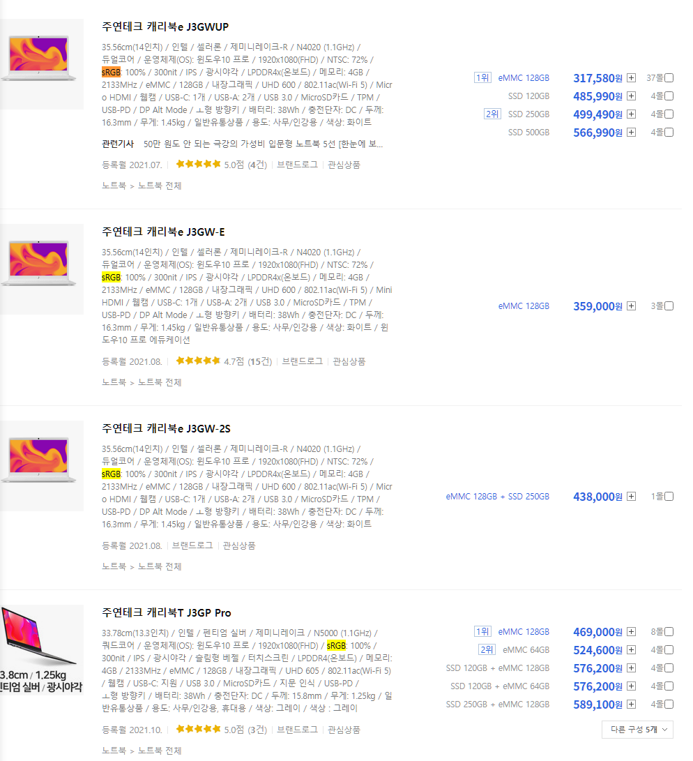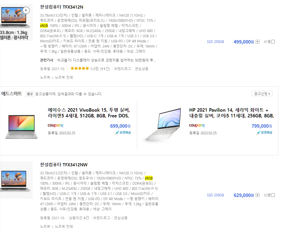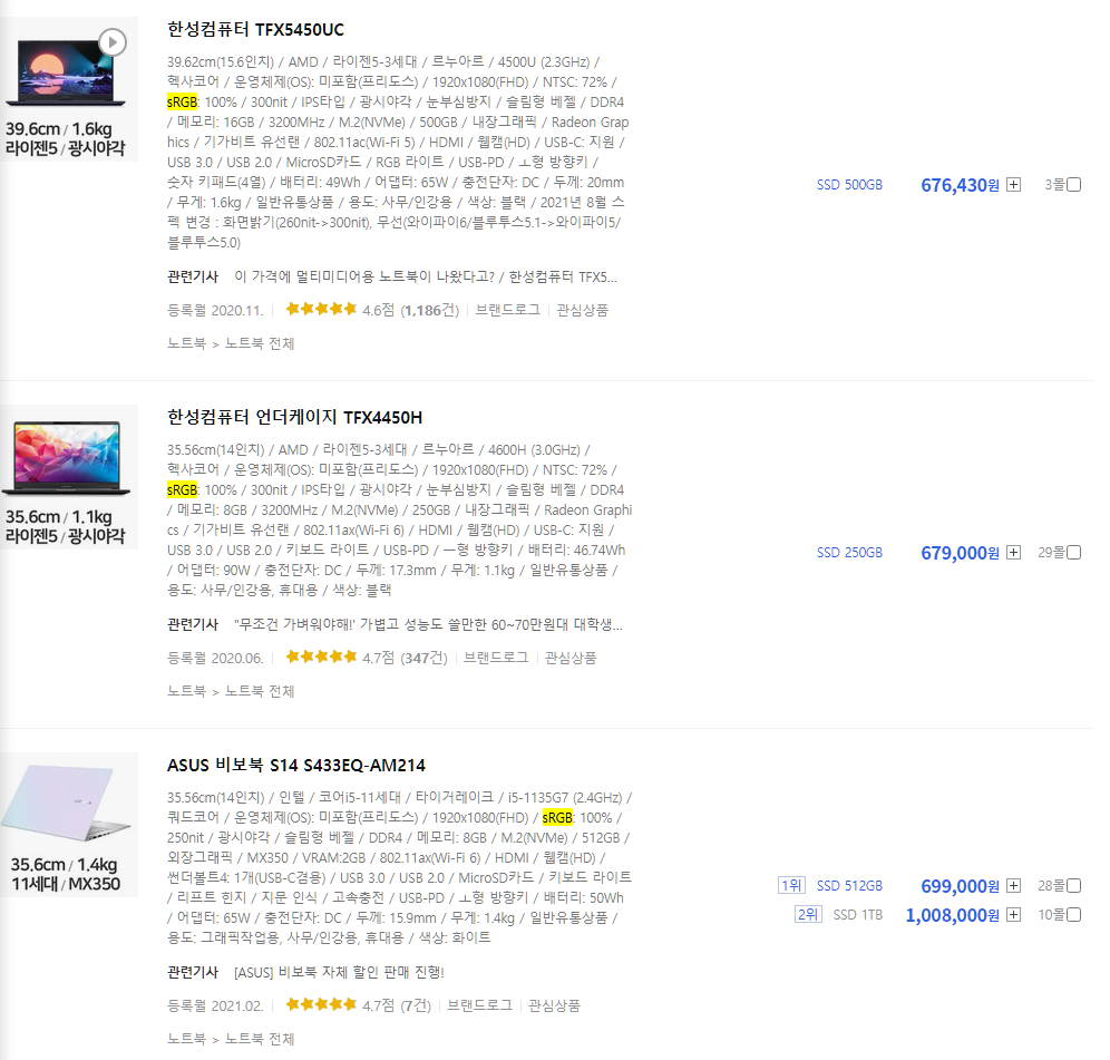 sRGB 100% 지원하는 노트북 중에서 상대적으로 저렴한 모델이 어떤게 있을까 하여 검색해봤다.