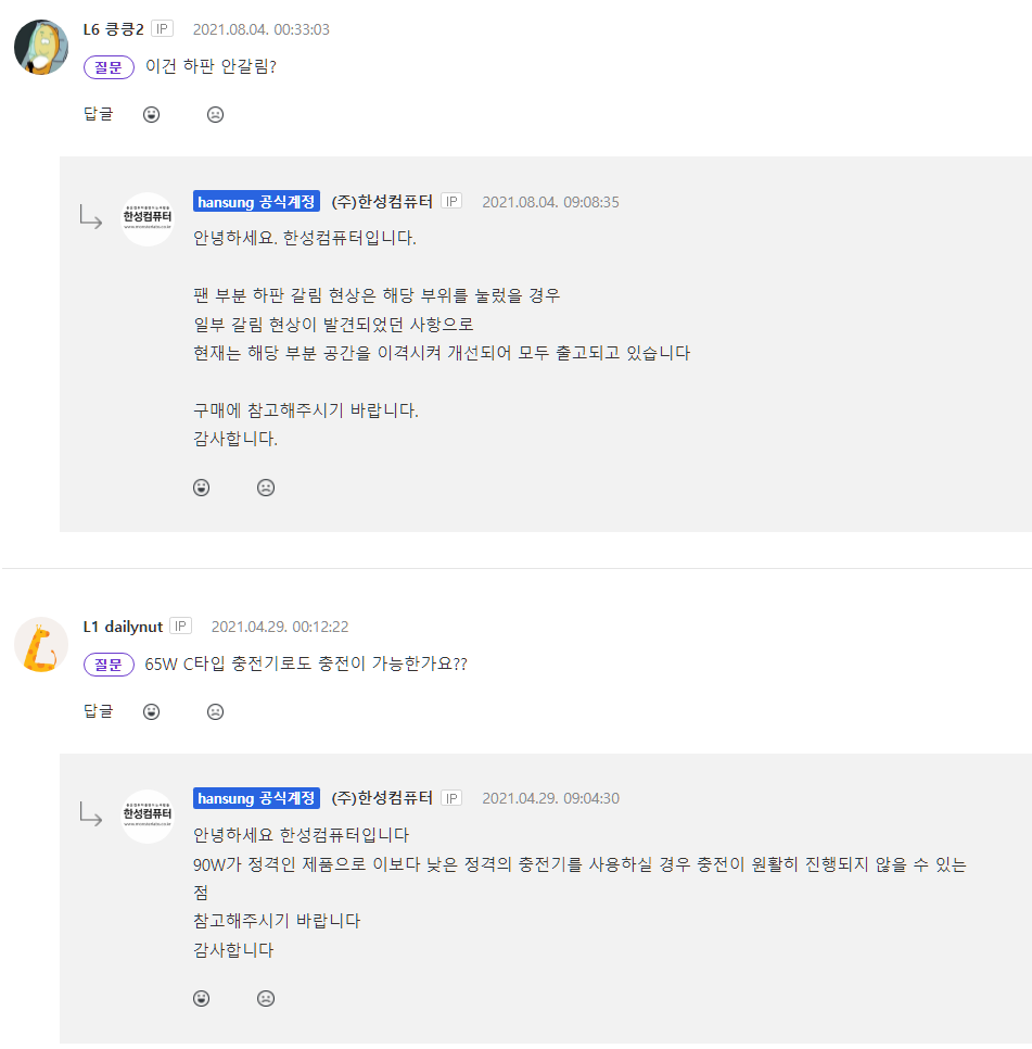후기나 문의에 위와같은 내용이 있었는데, 키보드 이슈나 팬 갈림 문제등이 있었던 것으로 보인다. 지금은 해결된 제품이 출고된다고 하지만 구입시 확인이 필요할 부분.